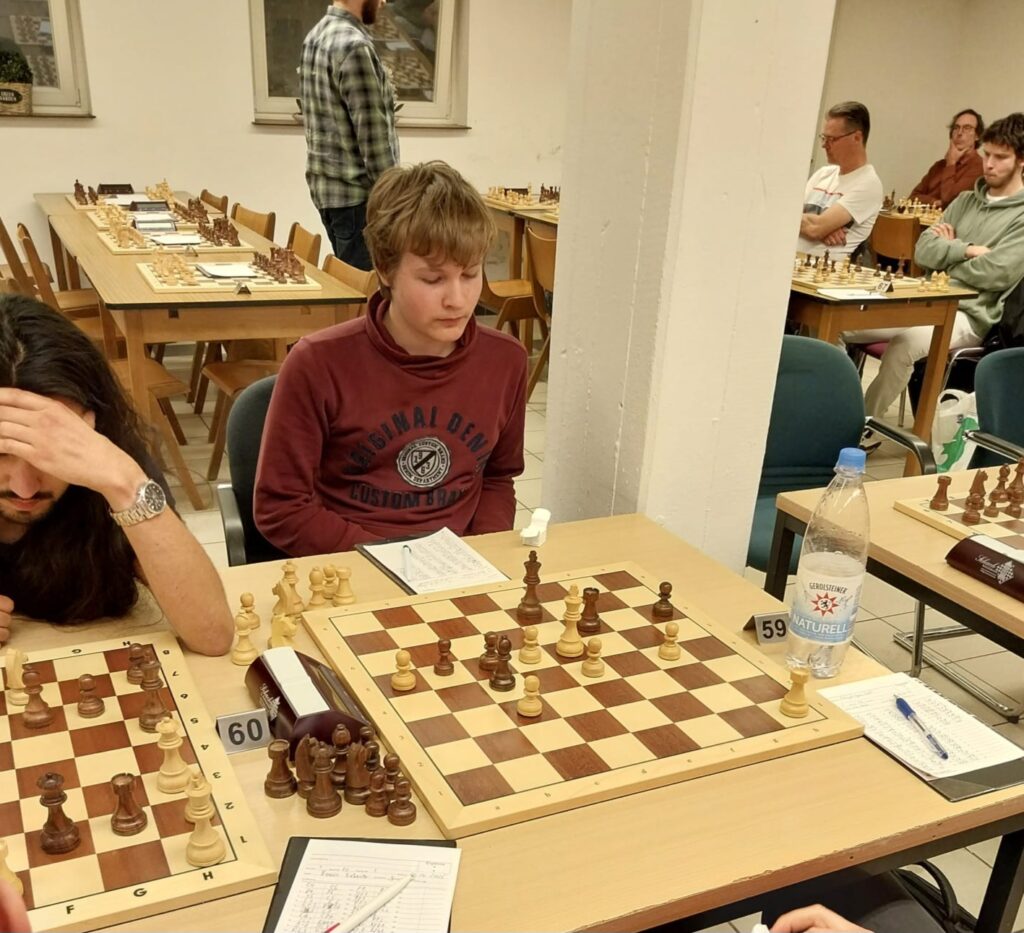 Vom 06.-09.06.2025 fand das 12. Pfingstopen in Krefeld statt. Enna, Ben, Timon, Dirk und ich (Hans-Joachim) nahmen zum ersten Mal an diesem mit einigen FIDE-Meistern stark besetzten Turnier teil. Uns war von vornherein klar, dass wir uns am unteren Ende des 160er-Starterfeldes wiederfinden würden, da alle in einer Gruppe spielten. Wir gingen somit am Freitag mit gedämpften Optimismus ans Werk, alle bis auf Dirk gegen nominell deutlich stärkere Gegner.