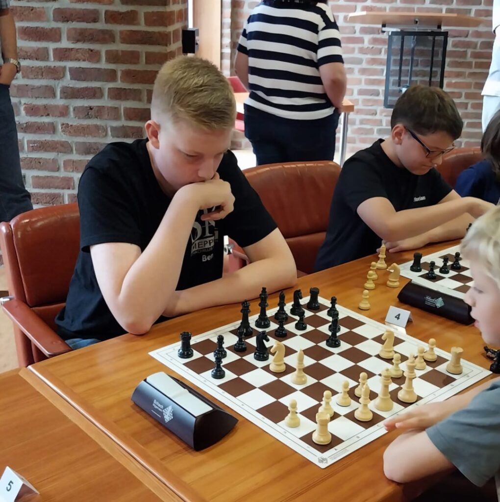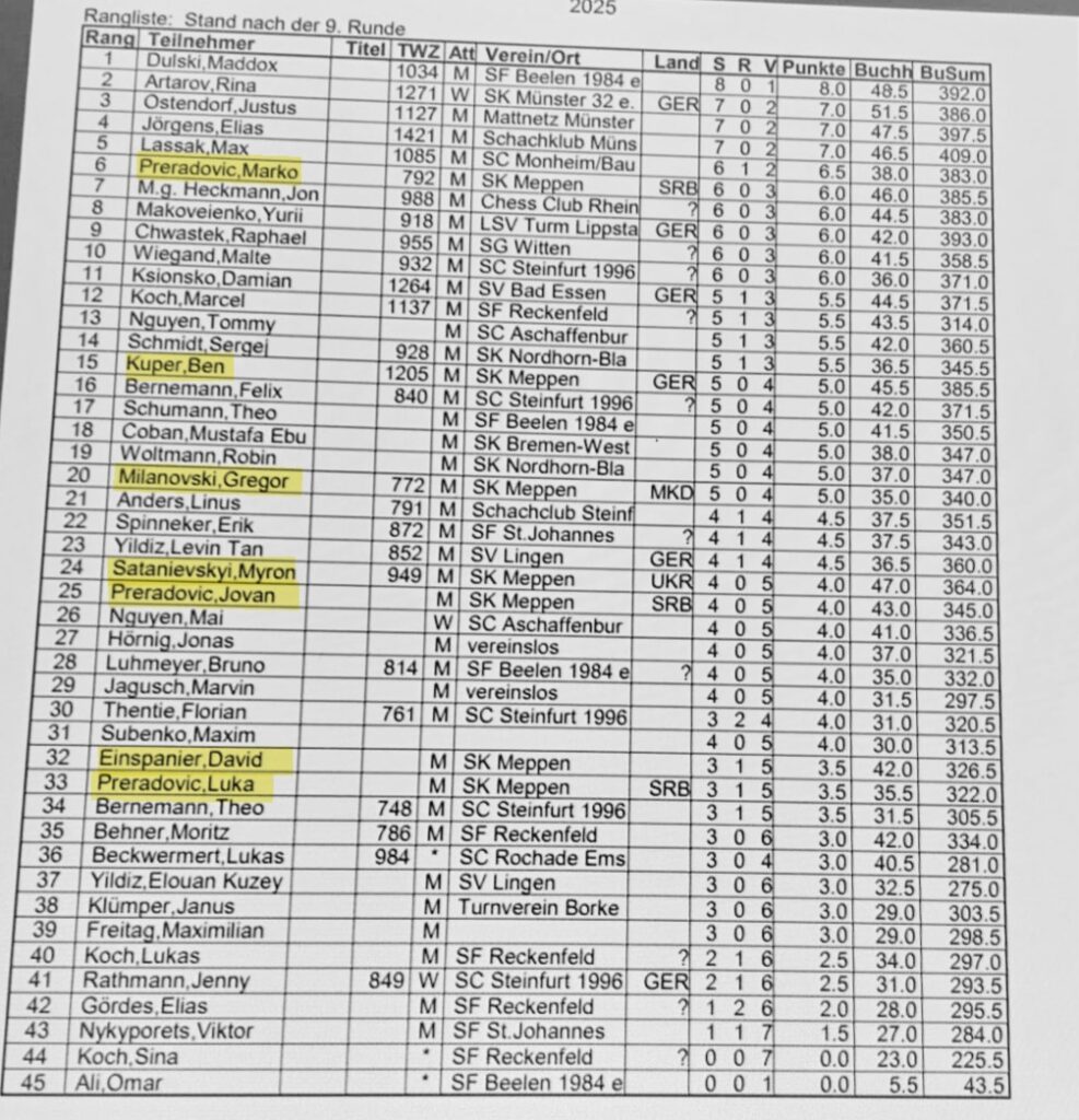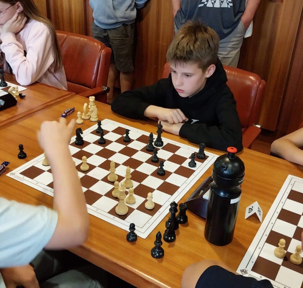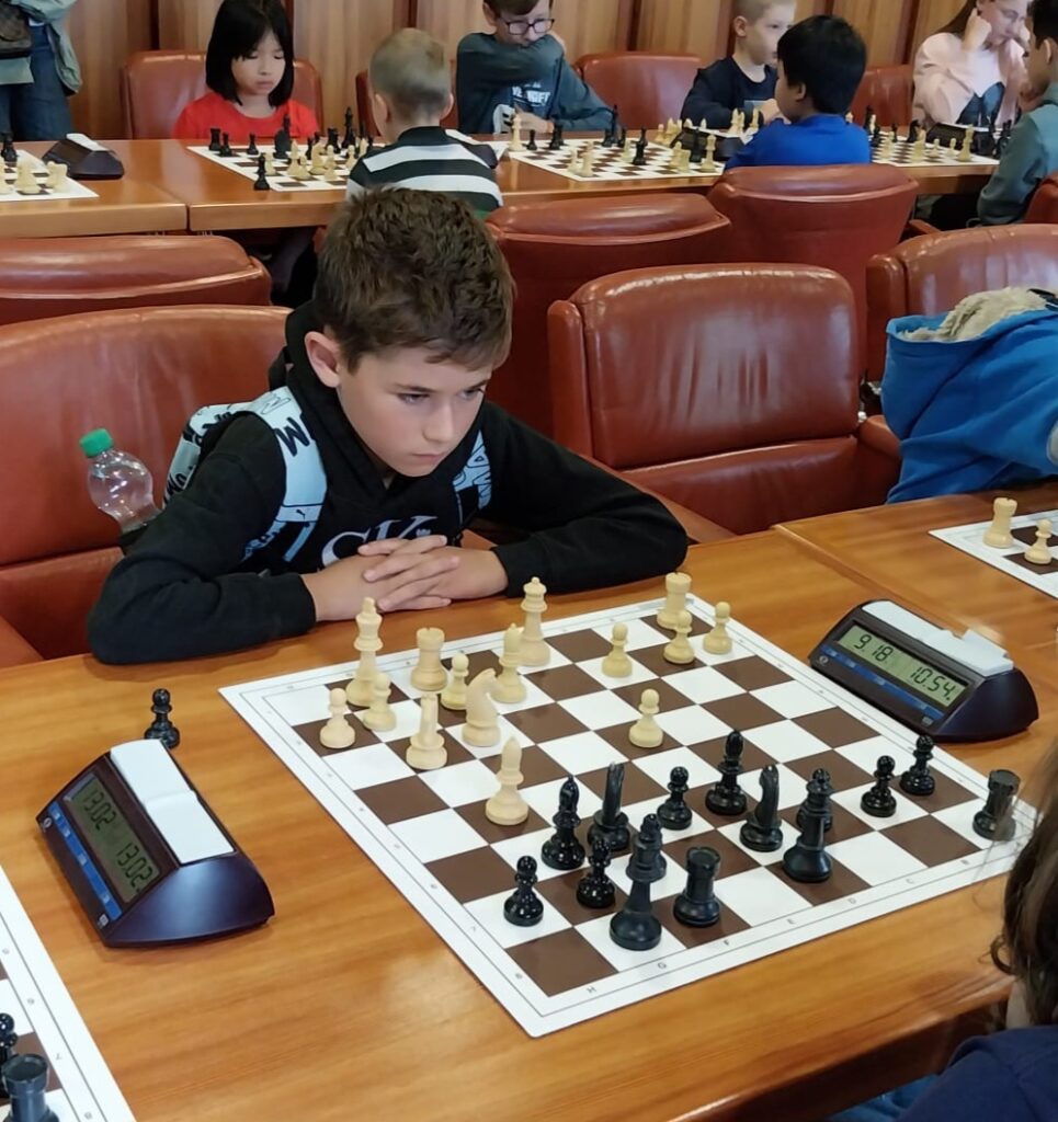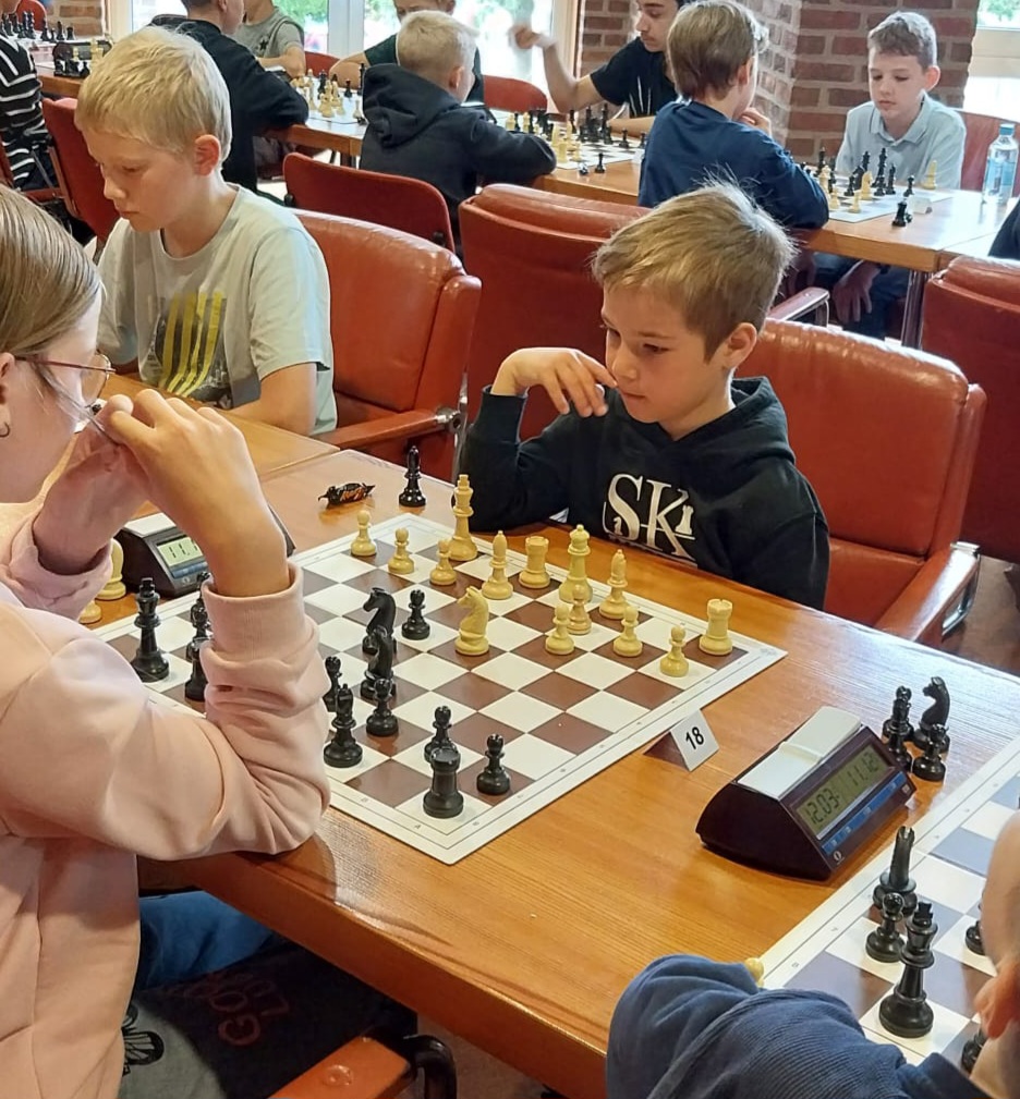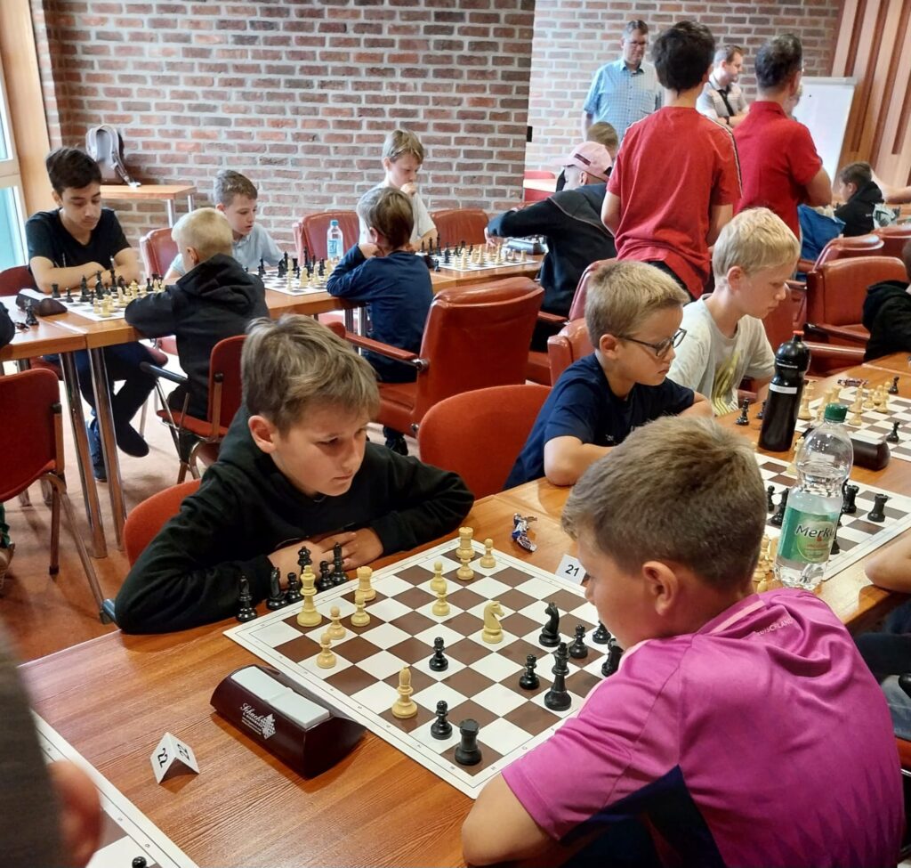 An diesem 9-ründigen Turnier nahmen wir in diesem Jahr mit 7 Nachwuchsspielern teil: Ben, Myron, David, Gregor, Jovan, Luka und Marko. Damit stellten wir mit 7 von 45 Aktiven die meisten Teilnehmer! Gespielt wurden 9 Runden Schnellschach mit einer Bedenkzeit von 13 Minuten und 2 Sekunden Inkrement pro Zug. Für Gregor verlief der Auftakt unglücklich, verlor er doch gegen eine starke Gegnerin durch Zeitüberschreitung. Immerhin konnten wir in Runde 1 insgesamt vier Siege landen.