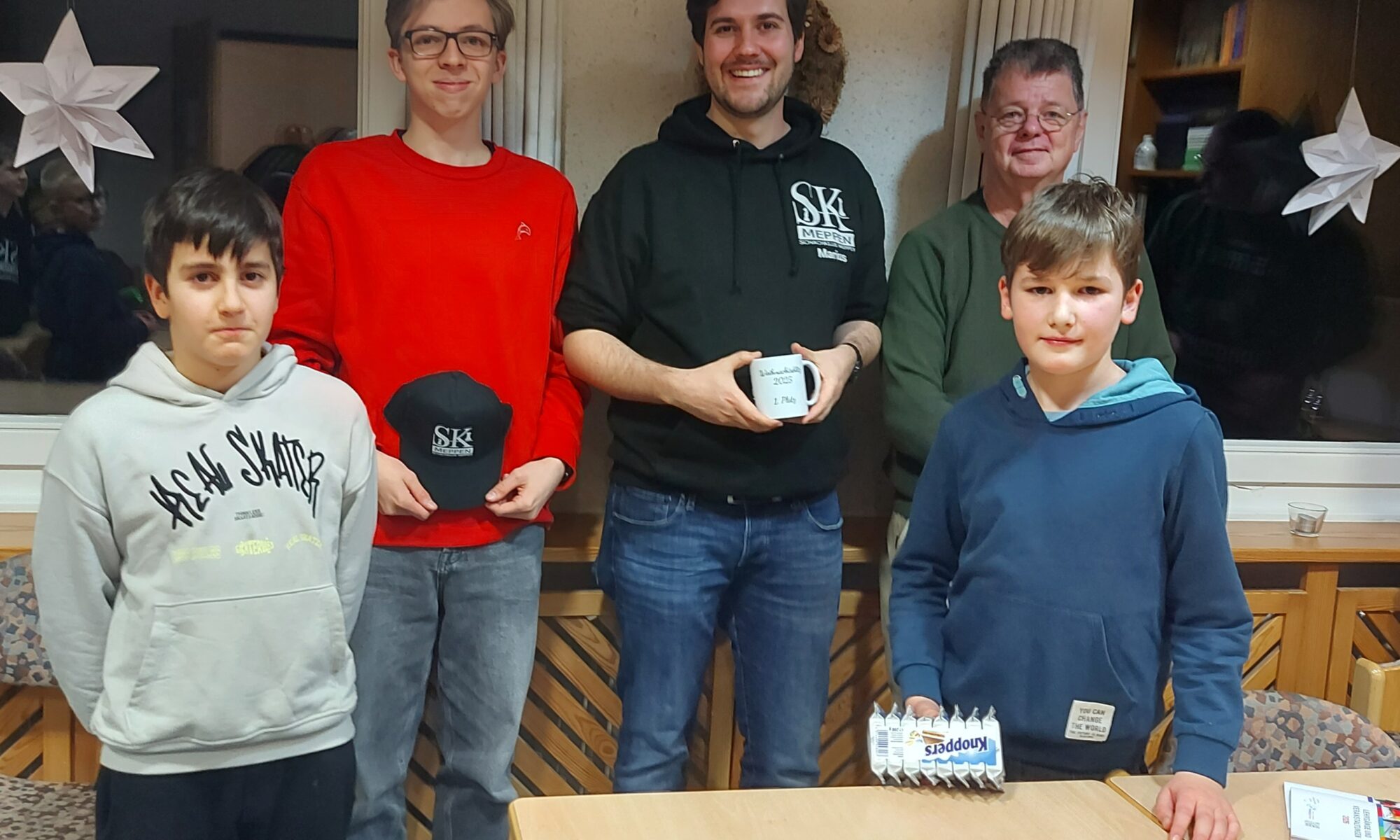 Auch 2025 spielten wir wieder das traditionelle Weihnachtsblitzturnier aus, diesmal schon vor Weihnachten am 23. Dezember. Gespielt haben wir 7 Runden Schweizer System, zum ersten Mal mit 3 Minuten Bedenkzeit + 2 Minuten Inkrement pro Zug. Dabei haben alle in einer großen Gruppe gespielt, wobei die zwei jeweils besten in U18 und U12 eigene Preise erhielten. Mit insgesamt 30 Teilnehmenden war damit fast die Hälfte des Vereins zeitgleich am Brett! Auch wenn wir das nicht historisch wasserfest überprüfen können, müsste dies das größte Weihnachtsblitzen der Vereinsgeschichte gewesen sein. Doch nun zum sportlichen: