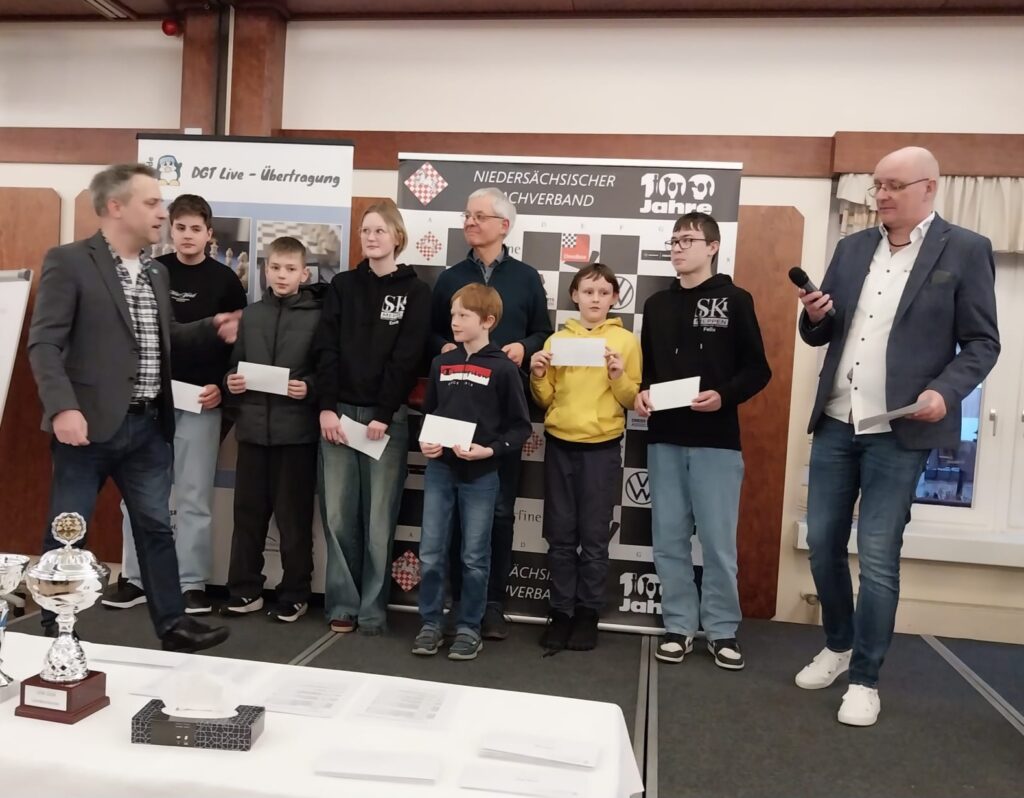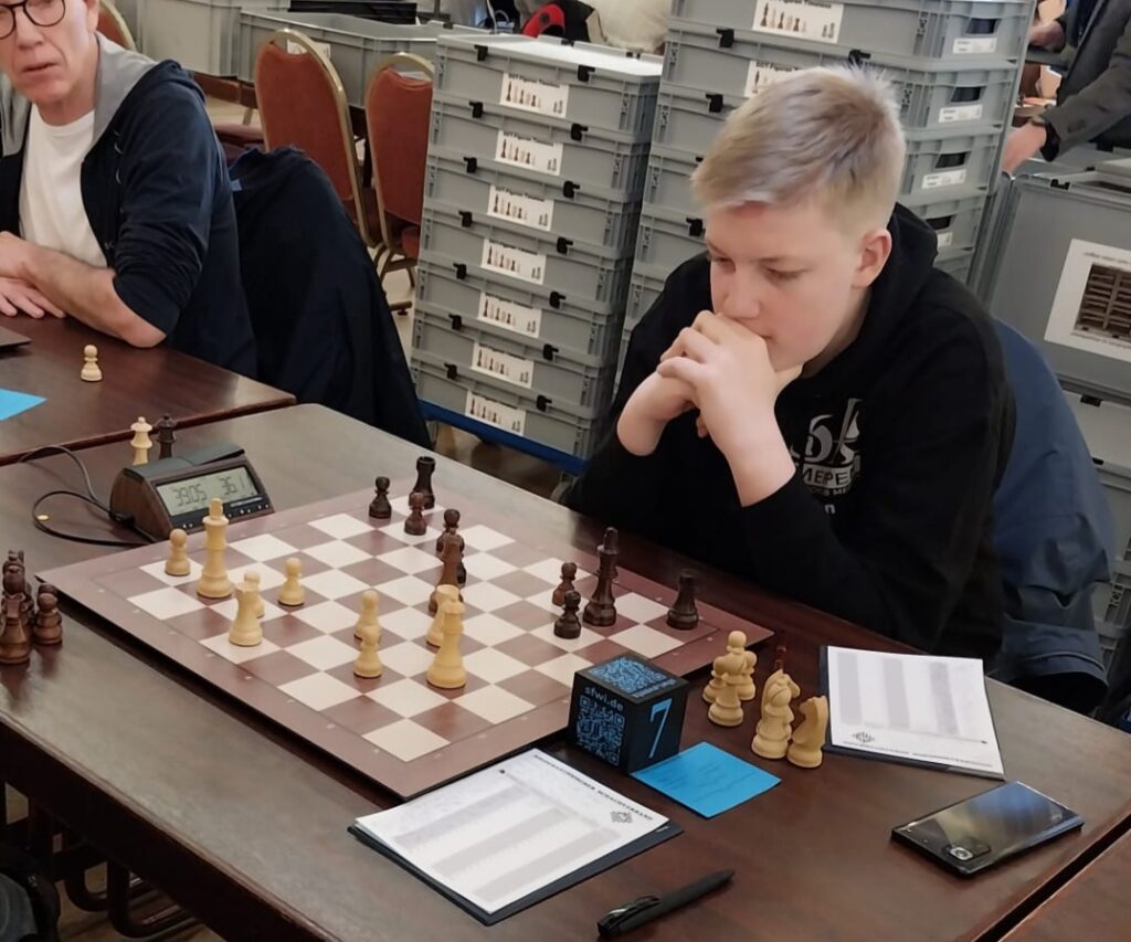 Felix und Ben erreichten 4 Punkte, was insbesondere für Felix ein hervorragendes Ergebnis ist. Er gewann den 1. Preis in der Ratinggruppe < 1100 DWZ und konnte diese Grenze durch das Turnier direkt deutlich überschreiten, er hat nun 1214 DWZ. Hans-Joachim beendete das Turnier mit 2½ Punkten.