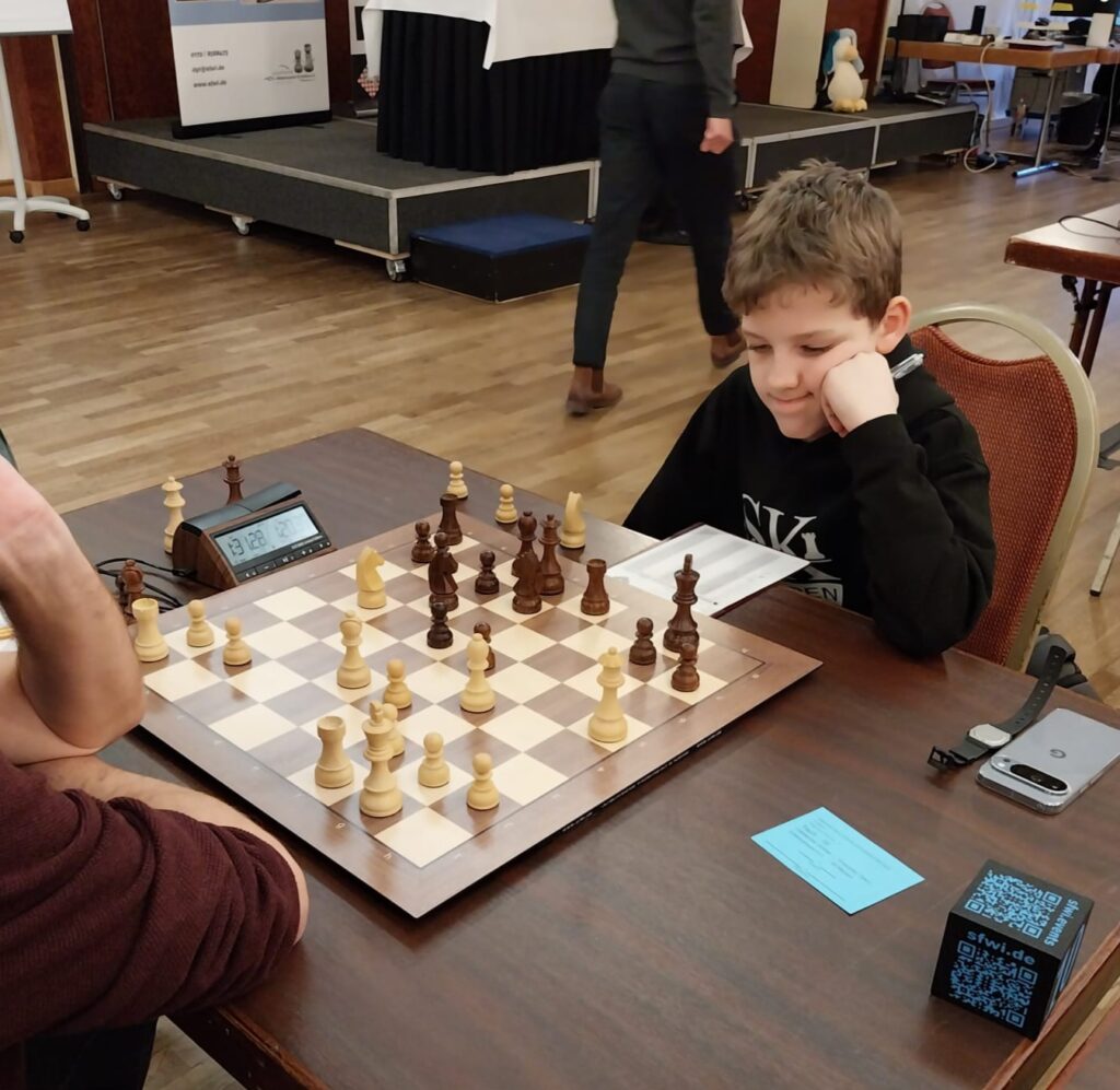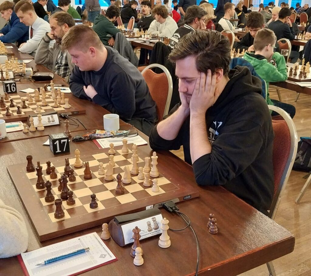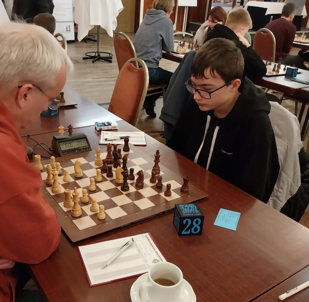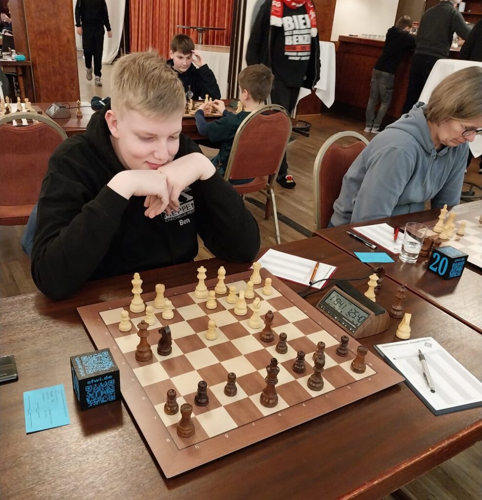 David gelang am ersten Tag als einzigem Meppener ein perfekter Start mit 2 aus 2 Punkten, und das bei seinem erst dritten Langzeitturnier! Möglich wurde dies allerdings auch, weil Ben in eigentlich gewonnener Stellung ein Matt in 2 Zügen gegen ihn übersah. Am Ende landete David mit starken 3 Punkten auf Platz 38.