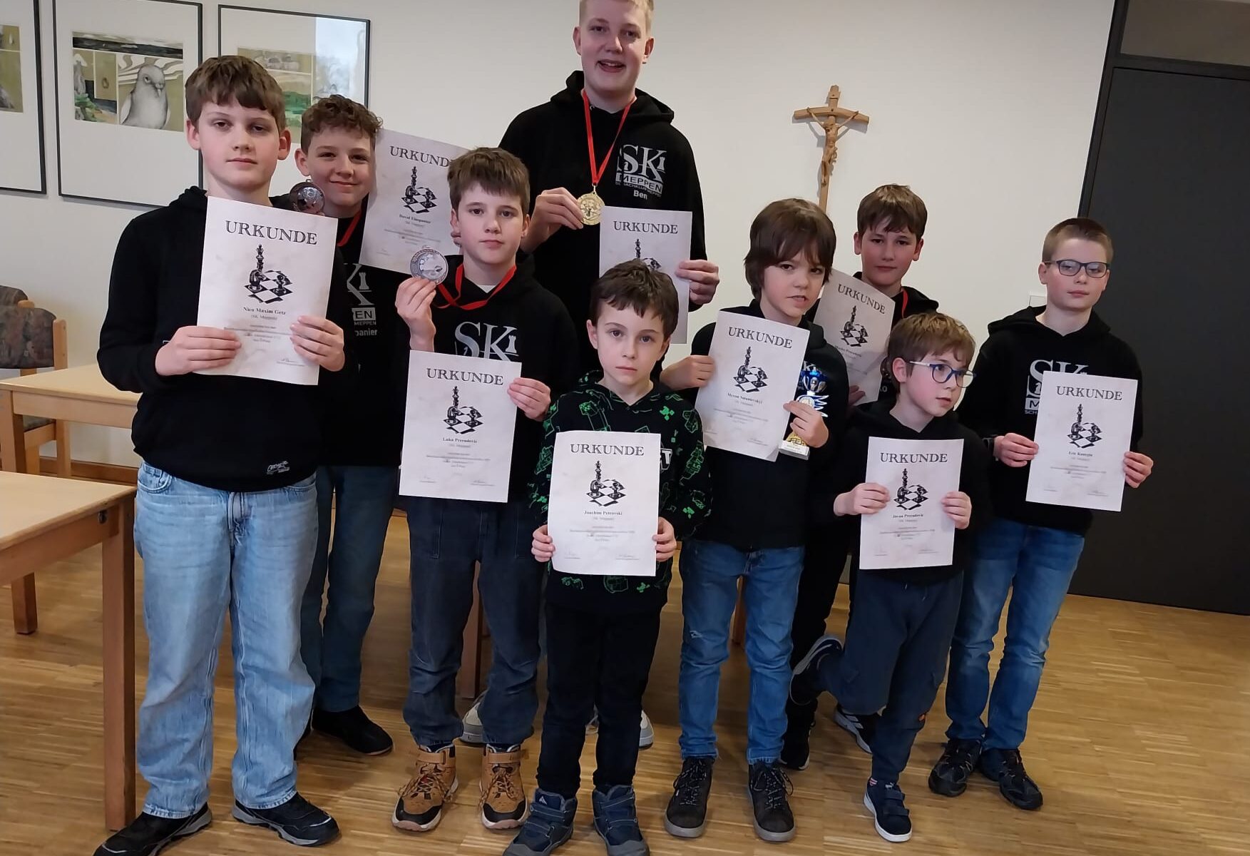 Myron, Joachim und Jovan gingen hier nach dem erfolgreichen Start bei der BJMM hoch motiviert an den Start. Myron und Jovan gewannen die ersten drei Runden souverän. Dann führte das Los die beiden in Runde 4 gegeneinander. Hier setzte sich die größere Routine von Myron (8 Jahre) durch. Er entschied auch die 5. Runde für sich und führte als einziger verlustpunktfrei das Feld an. In Runde 6 erlitt er, wie in letzter Zeit häufiger gesehen, eine unnötige Niederlage. Das machte das Rennen noch einmal ungewollt spannend. Diesmal gewann er jedoch auf Grund der besseren Drittwertung den Titel. Herzlichen Glückwunsch!