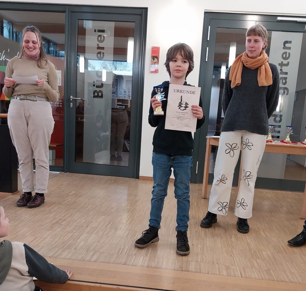 David war unser einziger Starter in dieser Altersklasse. Hier wurden 5 Runden mit einer Bedenkzeit von 25 Minuten und 5 Sekunden Zuschlag pro Zug gespielt. Hätte er in einer klaren Gewinnstellung (Dame und Turm gegen einen König) nicht Patt!!! gesetzt, wäre Rang 2 der Lohn gewesen. So musste er mit der Bronzemedaille vorliebnehmen.