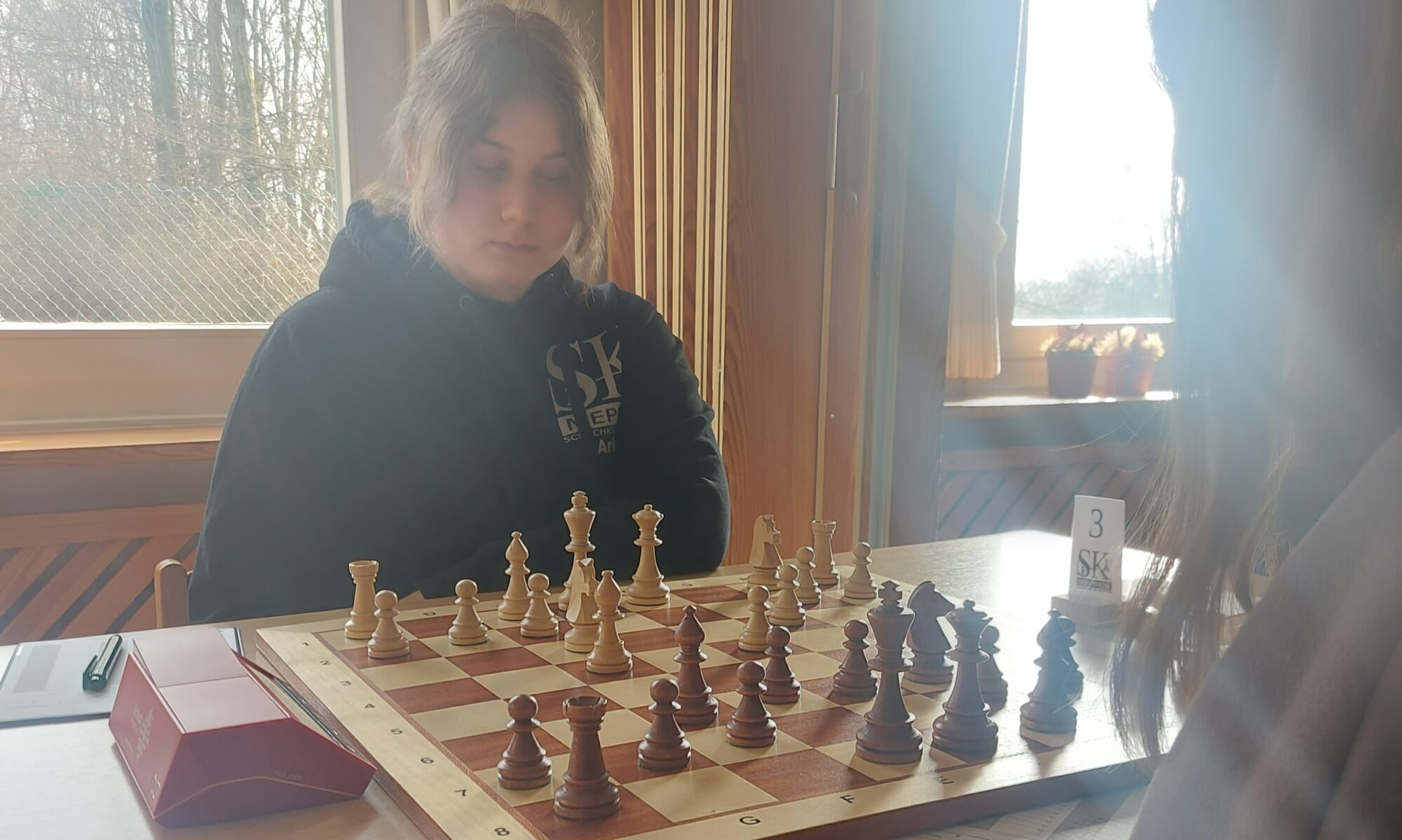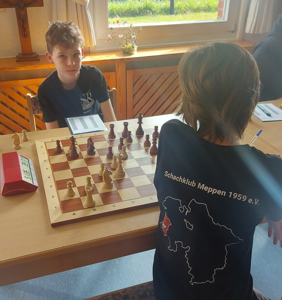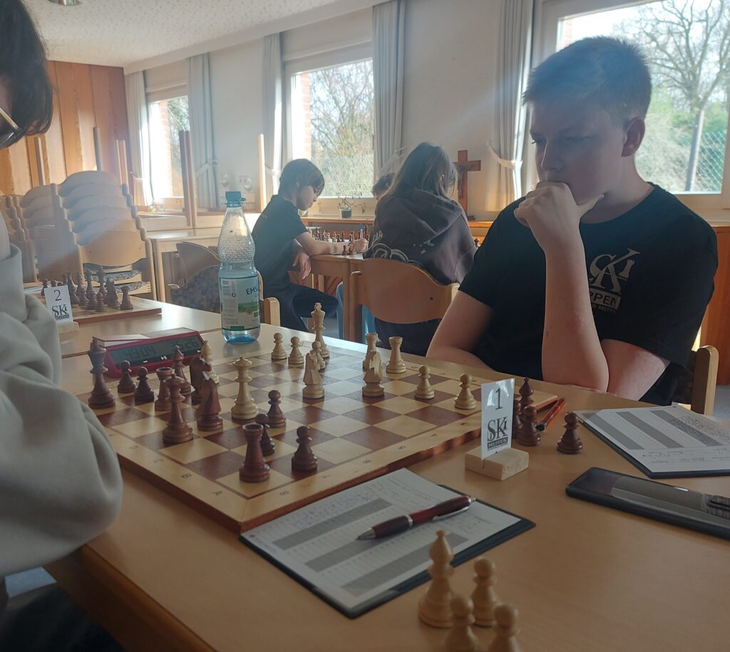 Die erste Begegnung starte unsere zweite Mannschaft mit einem 2:0 „Rückenwind“ durch zwei kampflose Bretter gegen den SV Lingen 2. Während Myron und David also ein Trainingsspiel gegeneinander spielen konnten, mussten Ariana und Ben gegen zwei Lingener ans Brett. Ariana konnte ihre Partie an Brett 3 nach einem frühen Figurengewinn in der Eröffnung gewinnen, wobei sie dann nochmal etwas Glück hatte, dass ihre Gegnerin ein inkorrektes Figurenopfer nicht annahm. Ben spielte an Brett 1 Remis zum 3½ zu ½ Sieg.