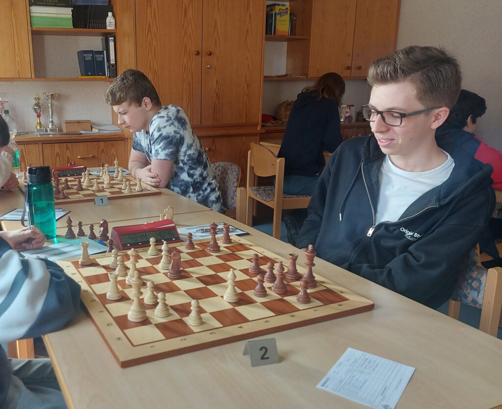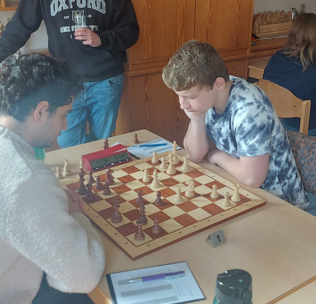 Die erste Entscheidung fiel an Brett 3. Timon verlor zügig drei Bauern und musste die Segel streichen. An Brett 4 spielten Enna und ihr Gegner eine unterirdische Partie; beide können es eigentlich besser. Zwischenzeitlich übersahen beide ein einzügiges Matt. Schlussendlich verlor Enna mit recht wenig Zeit auf der Uhr ein Damenendspiel mit einem Springer mehr, weil sie mit dem König ins offene Feld lief und dadurch den Springer per Gabel einstellte. Wie liefen also einem 0:2 Rückstand hinterher.