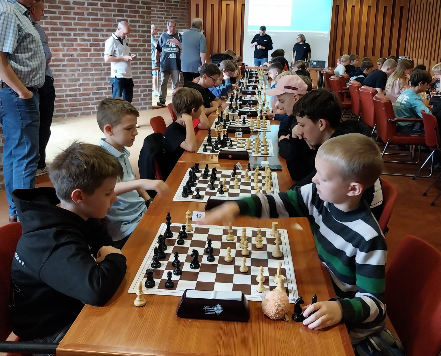 An diesem 9-ründigen Turnier nahmen wir in diesem Jahr mit 7 Nachwuchsspielern teil: Ben, Myron, David, Gregor, Jovan, Luka und Marko. Damit stellten wir mit 7 von 45 Aktiven die meisten Teilnehmer! Gespielt wurden 9 Runden Schnellschach mit einer Bedenkzeit von 13 Minuten und 2 Sekunden Inkrement pro Zug. Für Gregor verlief der Auftakt unglücklich, verlor er doch gegen eine starke Gegnerin durch Zeitüberschreitung. Immerhin konnten wir in Runde 1 insgesamt vier Siege landen.
