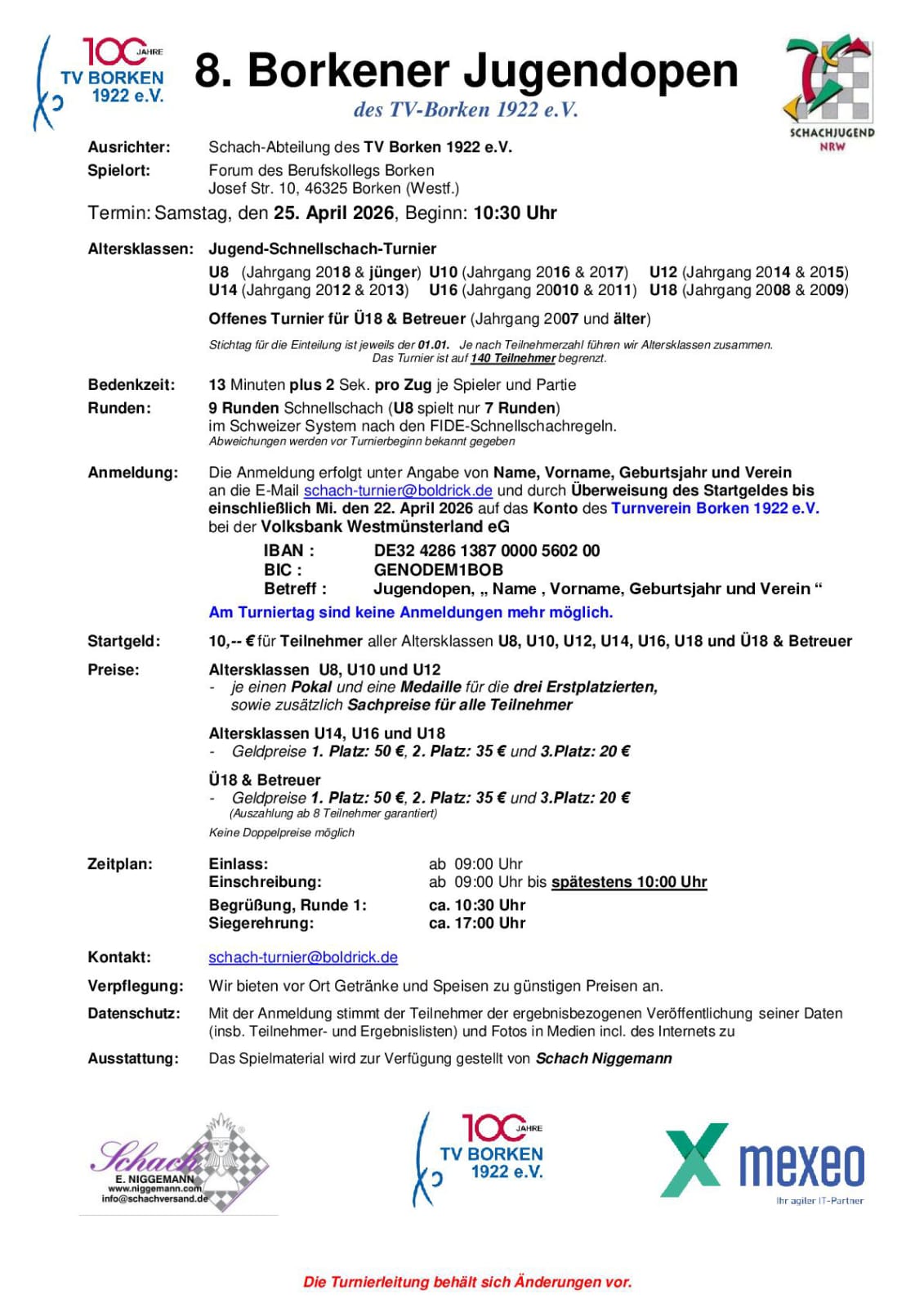 8. Borkener Jugendopen 25.04.2026 Ganztägig Zum Kalender hinzufügen ICS herunterladen Google Kalender iCalendar Office 365 Outlook Live Forum des Berufskollegs Borken Josef Str. 10, Borken (Westf.), 46325 Weitere Turniere